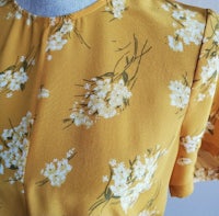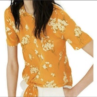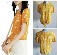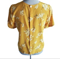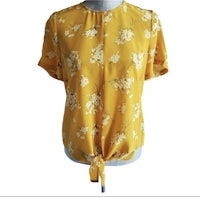 A tie-front top with buttons all the way down the back for your basic "party in front, party in back" situation. In a pretty '40s-inspired print, this silk shirt is an office-friendly option as easy to toss on as a tee.