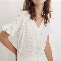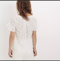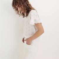 Made of timeless eyelet fabric, this just-right summer top has ruffles on the sleeves and an inverted box pleat at the back. Polished enough for work, breezy enough for not-work.