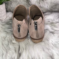 Exposed ankle, pinhole perforations, leather top stitching, noticed topline, almond-shape toe, back zipper entry
